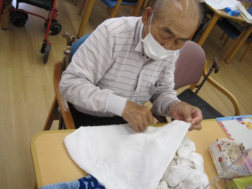 そして生活動作リハビリの一環として入浴の際に使用したタオルを干して頂いています。女性の方はお手の物!という感じでスイスイ干してくれています。普段は奥さんに任せっきりという男性陣もリハビリになる!と意気込んで熱心に取り組まれています。