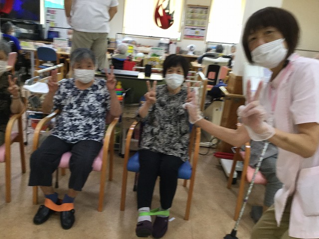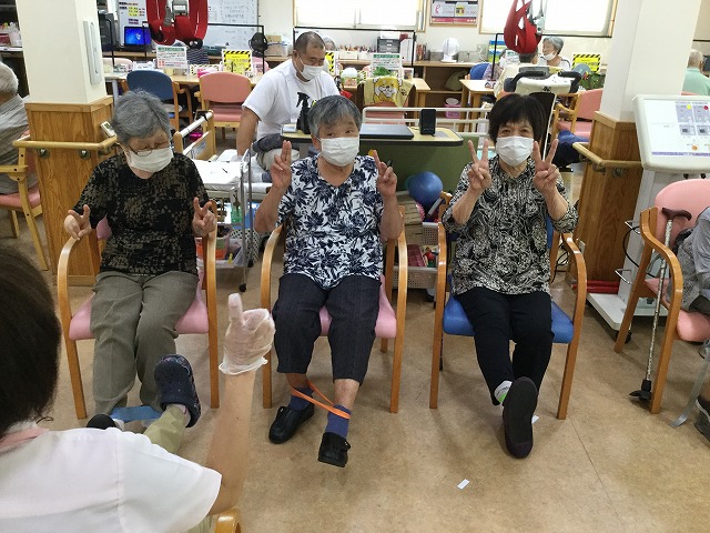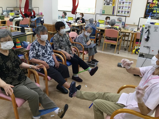 9月のある日、リハビリの方で、ゴム体操を行っていました。