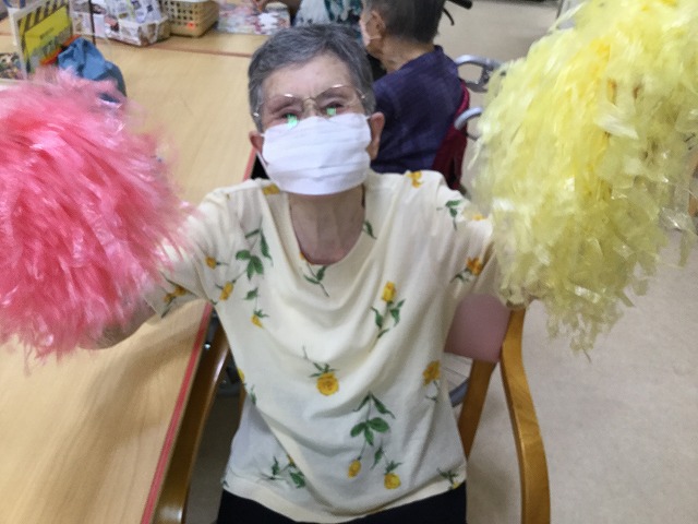 もちろん女性も、チアリーダーのようにポンポンを持って応援!「やっぱりこっちが勝つと思ったんよ」と、楽しそうに応援をされていました。腕の運動にもなって、良いですね。