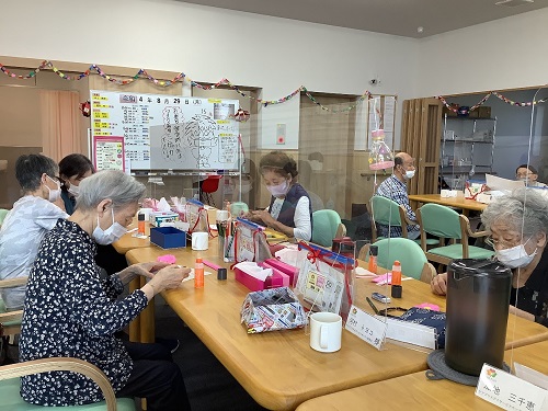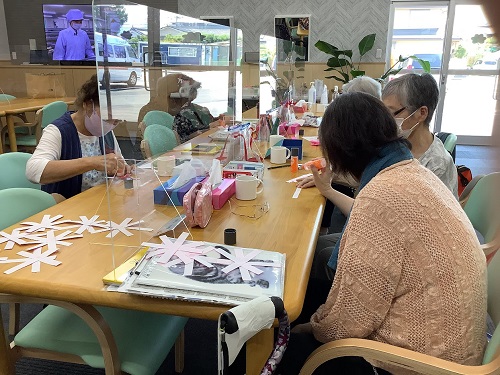 作られている様子を見ていると片麻痺があるご利用者様2人が協力し合って1人の方が折り紙を押さえて、もう1人の方が糊を付けるという連携プレーで作ってくださる様子をお見かけしました。