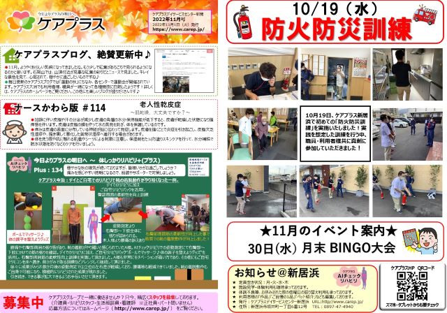 さて今回のケアプラス新聞は、10月19日に行われた「防火防災訓練」の様子をご報告いたします!
