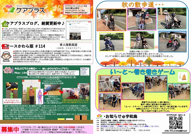 最近は夏と冬が長くなって、春・秋が短く感じますが、秋は季節の行事が盛りだくさんなので、残り少ない秋を満喫できるようにたくさんのレクリエーションを提供していきたいと思います。