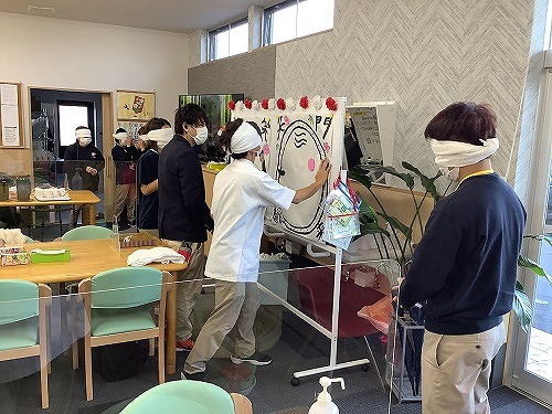 とりのこ用紙に福を書初めし、職員を男女チームに分けた後、目隠しをして福笑い開始!!