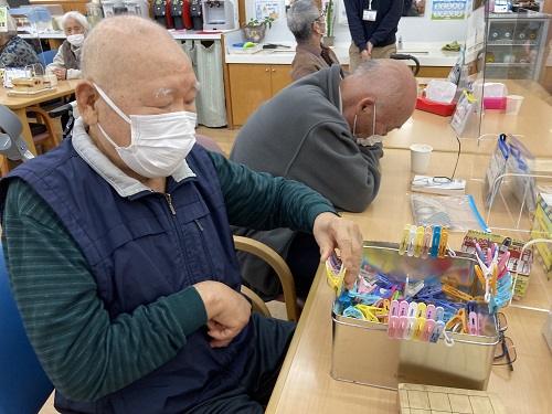 洗濯ピンを缶の周りに挟んでいく手のリハビリをされているところですね。シャツのボタン穴にボタンが入れやすくなったと喜ばれていました。