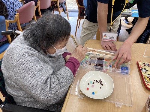 こちらの女性は小さな小豆を、お箸で掴まれているところです。肩を凝らさないように!