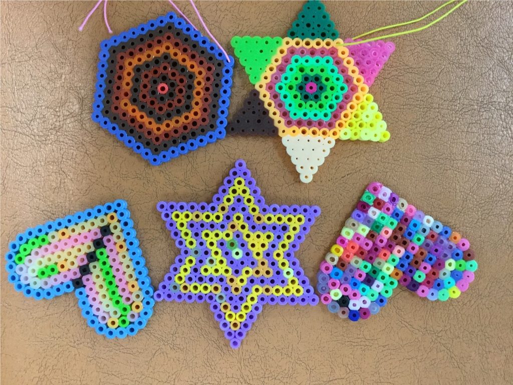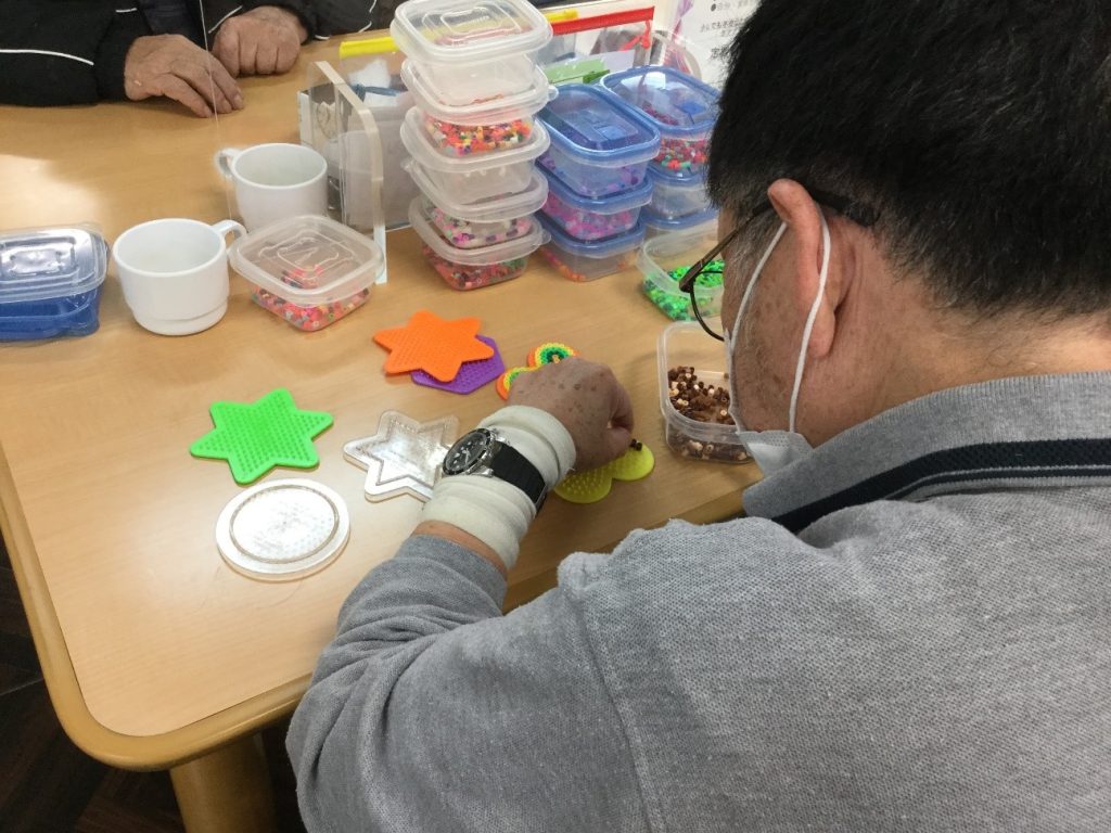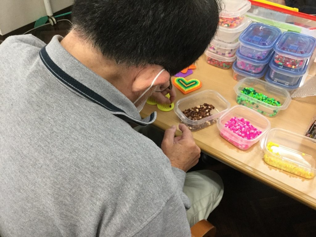次にアイロンビーズを楽しまれてるU様。イベントでアイロンビーズをしたのがきっかけで好きになりイベントの日以来、来所されるたびに作られるようになりました。作り始め頃は多数の色のアイロンビーズをただ形のピンに入れて作っただけのものでしたが、現在は配色を考えたり、デザインを考えたりと最初の頃に比べるととても上達されています。「奇麗に出来たらあげるね。」と今日もアイロンビーズ作りに励みます。奇麗なアイロンビーズが出来るのを楽しみにしています。