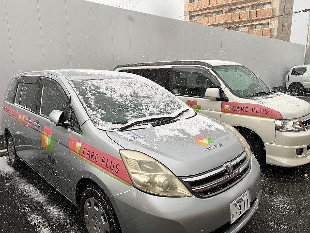 ケアプラスでも駐車場の送迎車輛が雪化粧して普段と違った見た目になっておりました(笑)