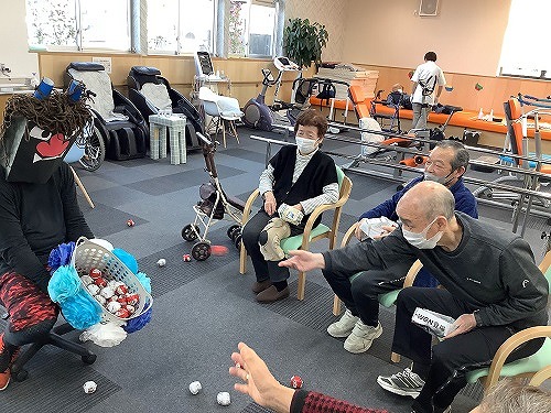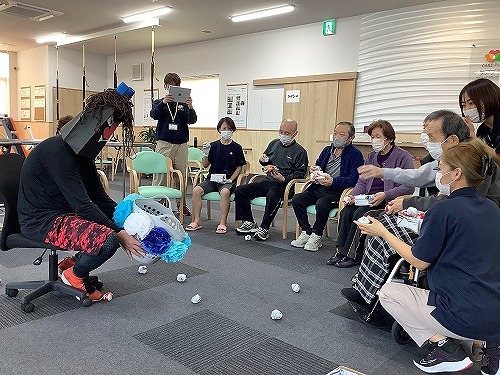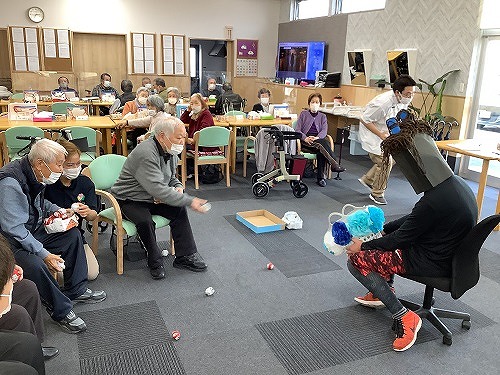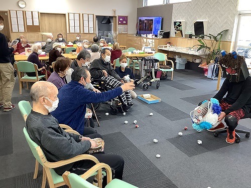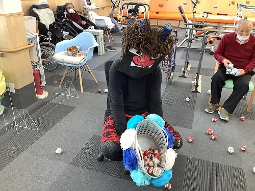 利用者様を3チームに分け、新聞紙で作った豆を鬼が持っているカゴに投げ入れるゲームです。