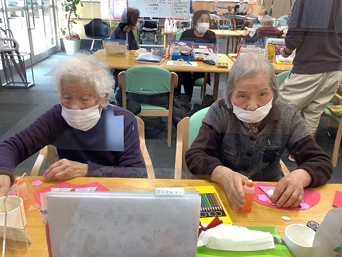 扇形に切った型紙にお雛様のパーツを貼り付け、思い思いに目や鼻、口を描いて頂き可愛らしいお雛様が仕上がりました。仕上がったお雛様をセンターテーブルの前面や、リハビリ室に貼り、いつでも目に入り季節感を味わって頂く事が出来、フロアー内が一層明るく華やかになり大好評です。いつでも、お雛様が皆を見守ってくれています。