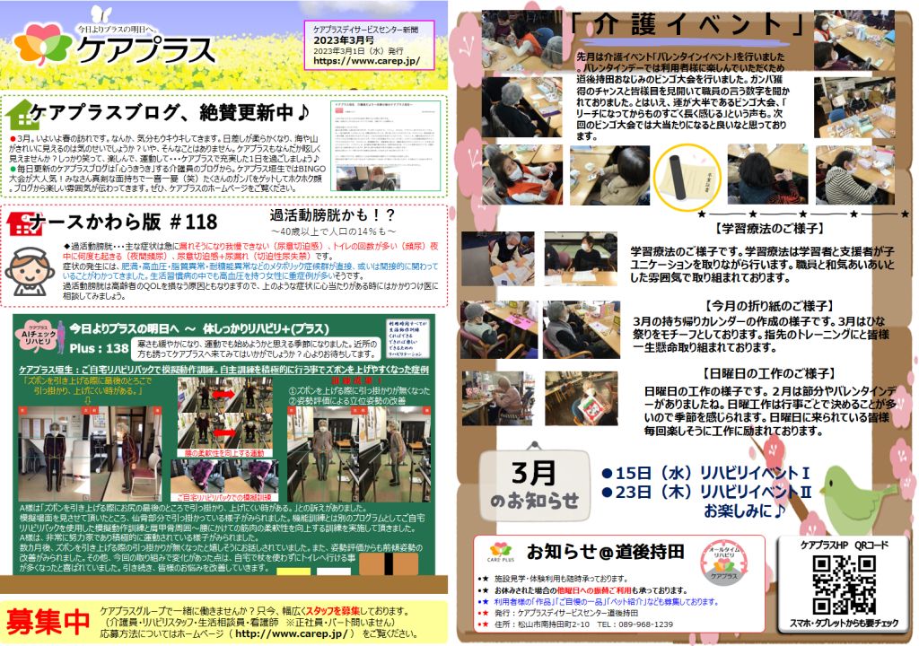 さて、ケアプラス道後持田新聞3月号が完成いたしました。