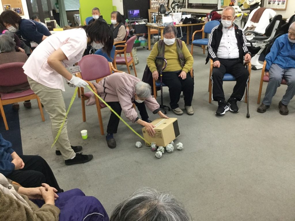 3チームに分かれ、丸くなってもらいます。真ん中に新聞紙を丸めたボールを15個まとめて置き、紐の付いた籠をボール目掛けて投げ、自分の前まで引き寄せ、チームの合計を競うゲームをしました。どのチームも自分が飛んでいきそうなくらい集中して投げられていました。