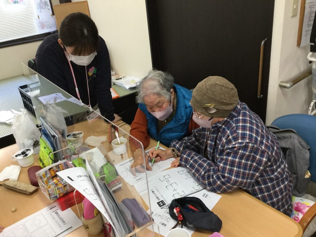 各テーブルに2枚プリントを配り、どんどん解いていきます。職員と協力し合いながら解き進めていきます。皆さんつまずくとこは一緒なようで見ている方もとても楽しかったです!ホワイトボードを使い、ヒントや答え合わせをして解らなかった問題の時はスッキリしていました!