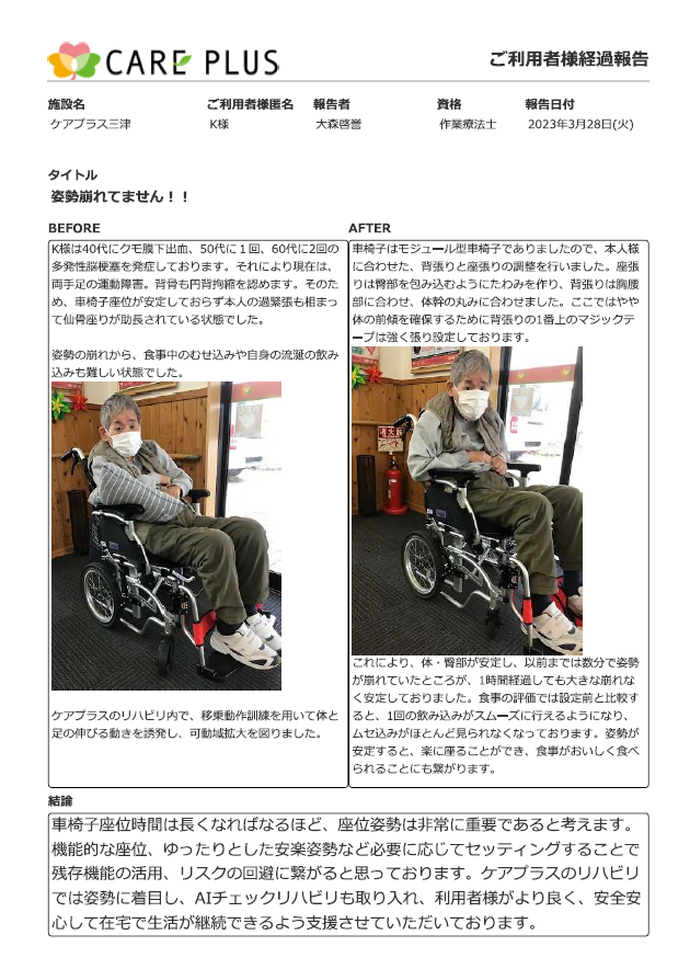 4月号のリハビリNEWSは車椅子の姿勢調整により、良姿勢が確保でき、食事動作が円滑に行えるようになった症例です。