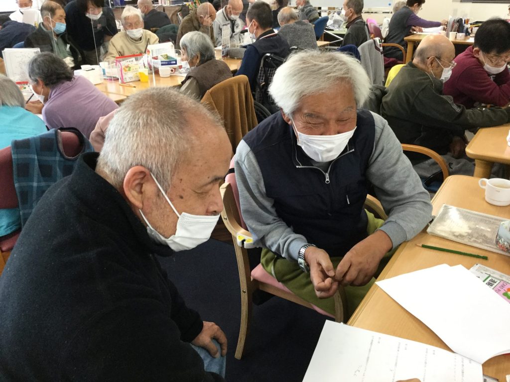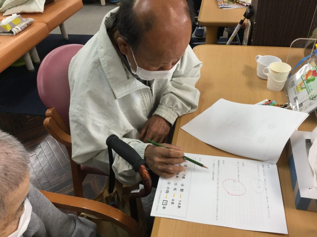 司会の方からヒントをもらうと「あ~、そっか。」と難しい問題も、ひらめいたようで、答えを記入されていました。最後に答え合わせをすると、「うん。合ってる。」と皆さん笑顔で職員から赤丸を貰い喜ばれていました。