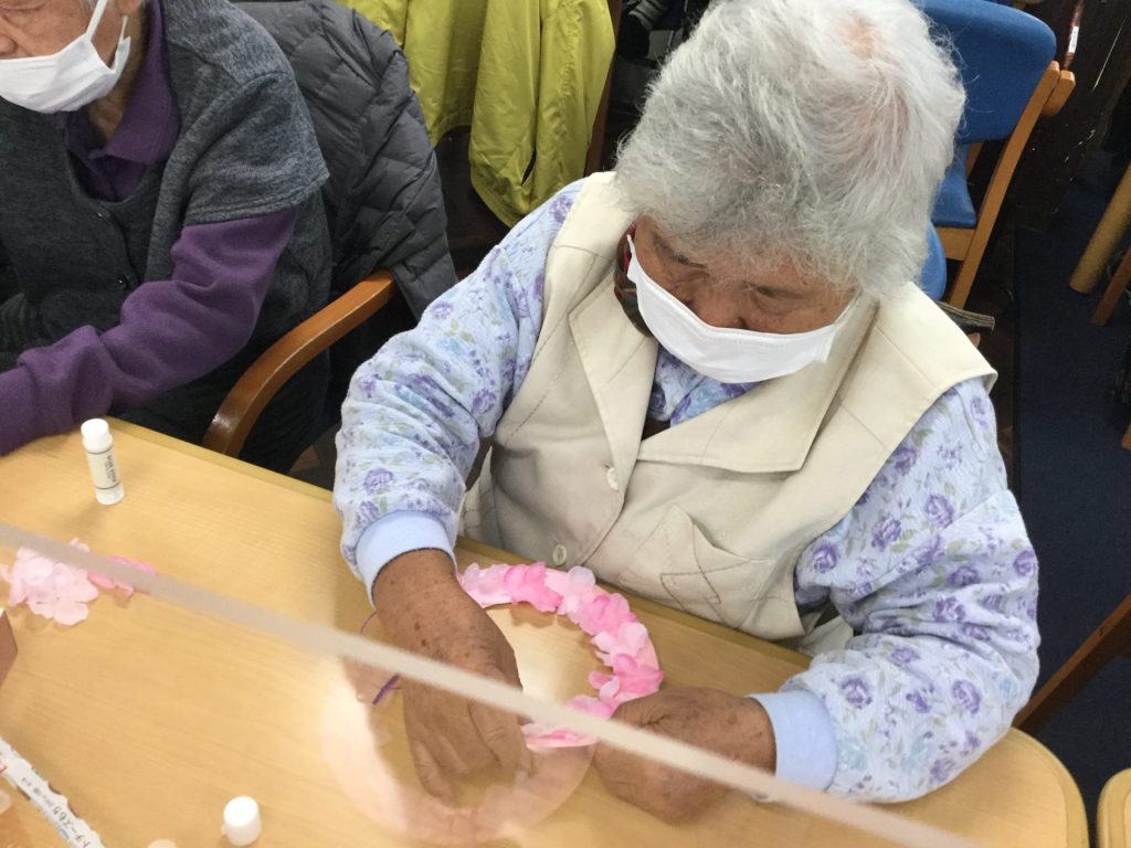 この日は春ということで、ピンク色の皿紙と桜の花びらでリースを作りました。あらかじめ真ん中を切り取った紙皿に皆様、思い思いに桜の花びらを張り付けていきます。花びらが重ならないように貼られる方、隙間なく沢山花びらを貼られる方。それぞれに個性的なリースが出来上がりました。