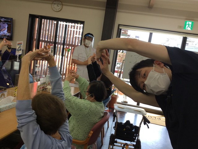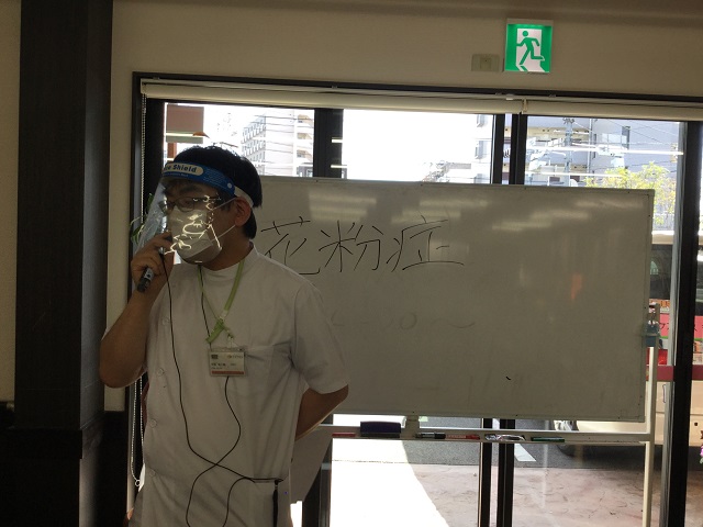 先月はリハビリ職員によるイベントを行いました。まず、この季節から特に悩まされている方が多い「花粉症」についてお話しさせていただきました。花粉症に悩まされている職員も多く、利用者様と一緒に聞き入っていました。また、利用者様共通の悩みと言っても過言ではない「肩こり腰痛体操」を行いました。日ごろから腰が、、肩が、、とお話を伺っておりますので一緒に体操を行いました。