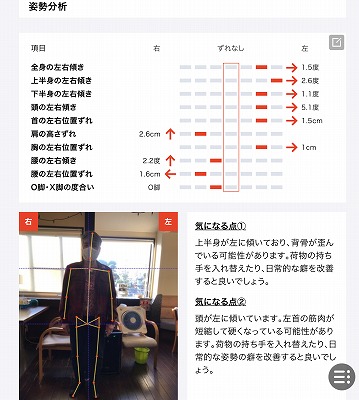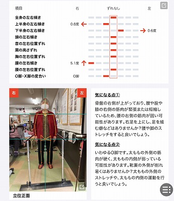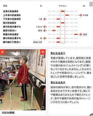 正面から見た写真では上半身、下半身、頭頸部、腰の位置の左に偏っていたのが改善しており、横から見た写真では上半身、頭部、腰の傾きの改善、膝の曲がり度合いの改善認めました。重心位置はより真っ直ぐに改善されています。