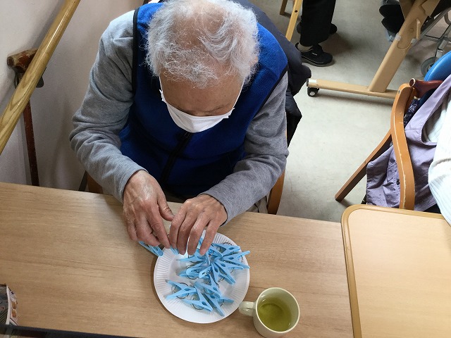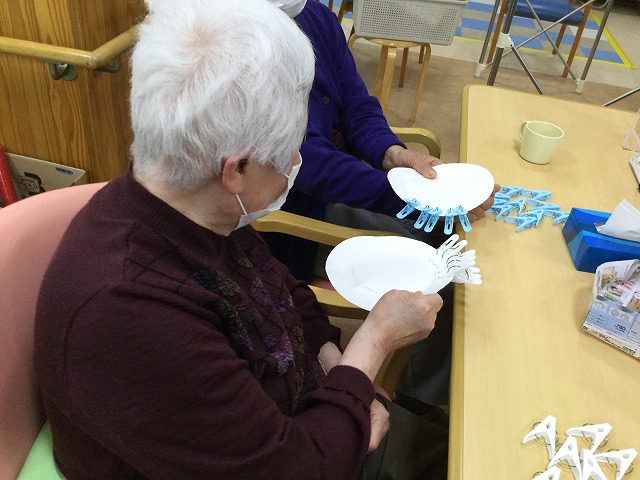紙皿を片手で持ち、反対の手で洗濯ばさみを挟む方、