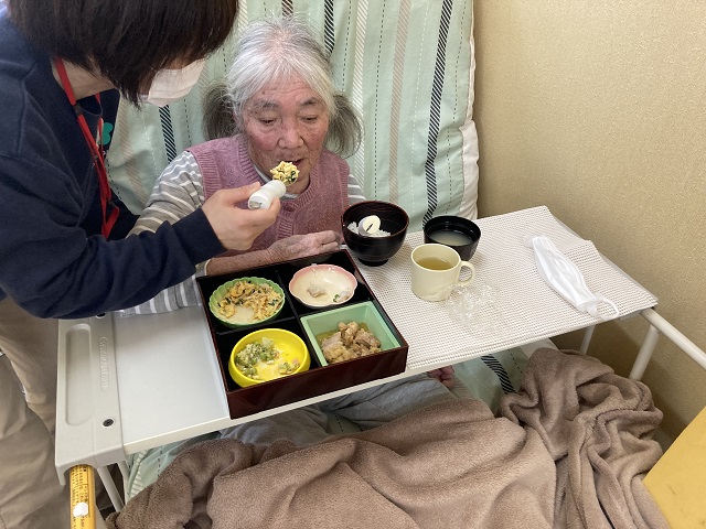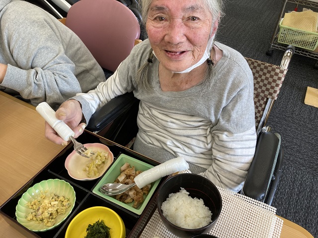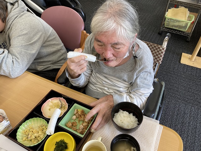 食事の際に食べ物を集める介助が必要な時もありますが、ご自身で食べ物を口まで運ぶことができるようになりました。