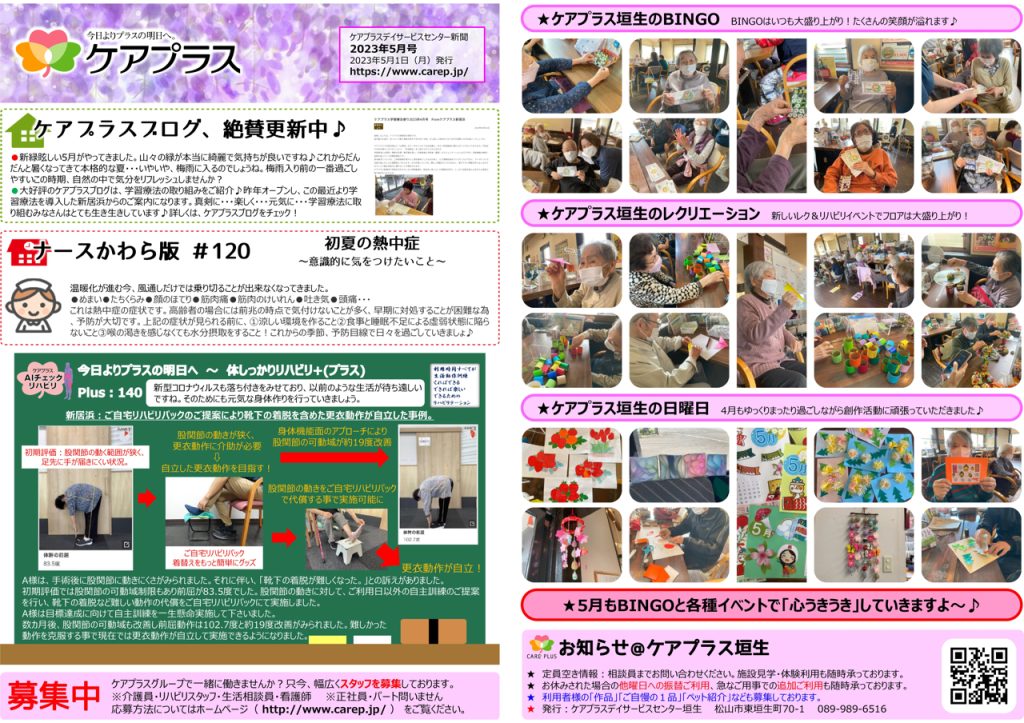 さて、ケアプラス垣生新聞5月号の紹介をします。