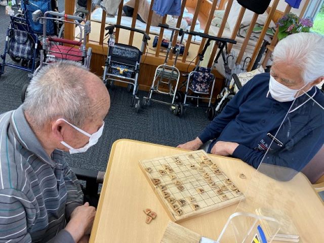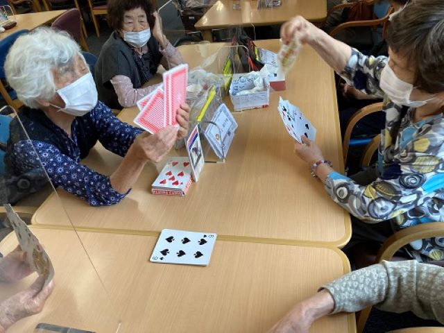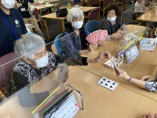 ケアプラス宇和島では晴れの日のレクリエーションはお散歩が一番人気ですが、雨が降る日は室内で楽しめるよう、花札や将棋、トランプ、カルタなど様々なボードゲームに参加して頂いております。