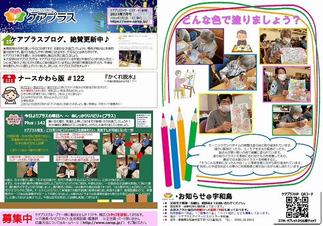 リハビリや入浴を待たれている間の「モーニングガンバタイム」の時間では塗り絵をされる方が多く、