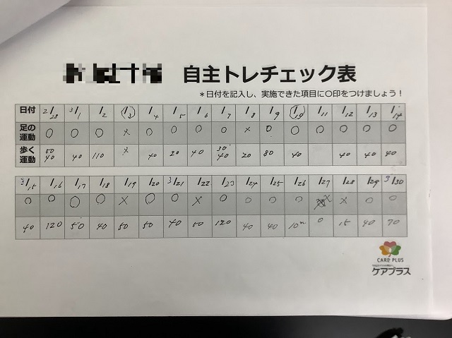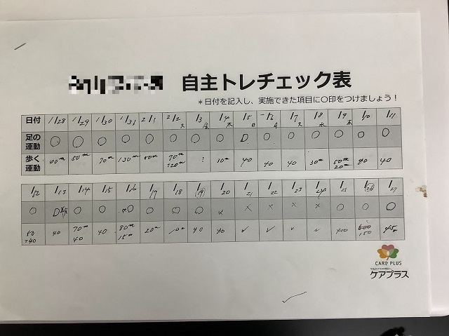 もともと歩行練習を日常的に行われていたこともあり、体調が優れない日以外はほぼ毎日運動を継続することができました。