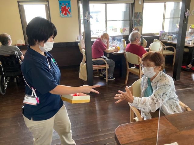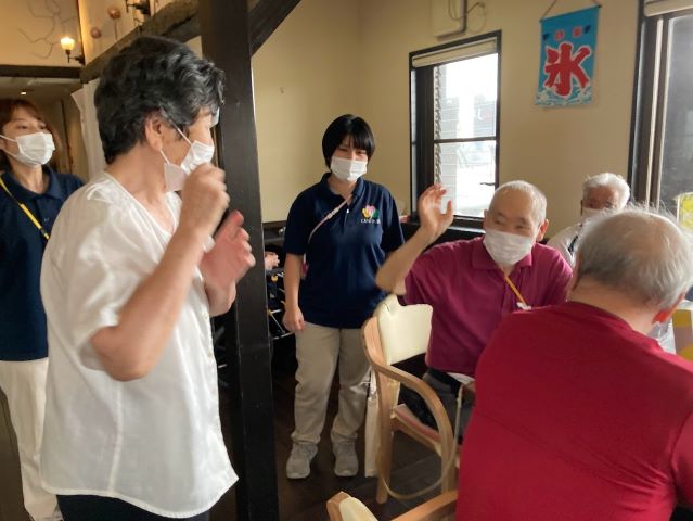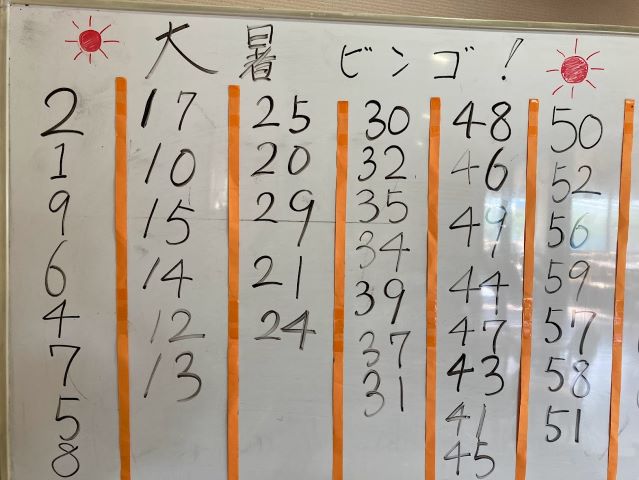 大暑ビンゴの日は日曜日でしたので利用者様の人数が少ない為、出勤している職員も全員参加で行いました。ビンゴの玉を出すのも職員、利用者様と交代で行いました。すると1位が職員!あらら…。(^^ゞ 某利用者様はリーチになってから「3を出して!」とずっと言われて期待されていましたが、 30番とか73番とか3のつく数字が続き、ようやく3が出された時は「出してくれてありがとう!」と、とても感謝されていました(笑)
