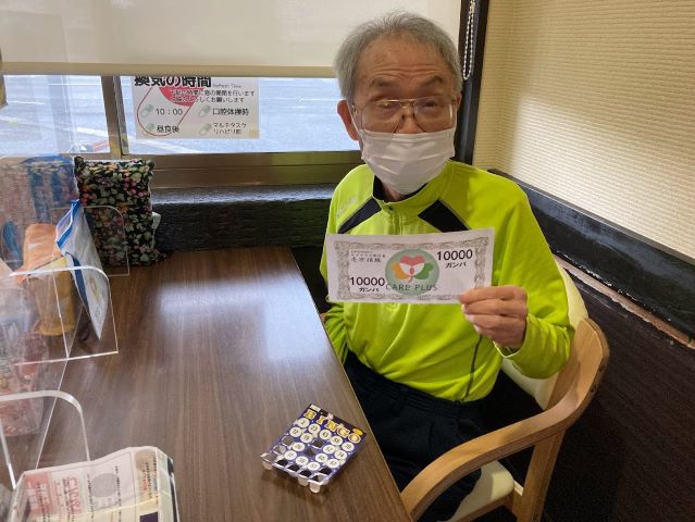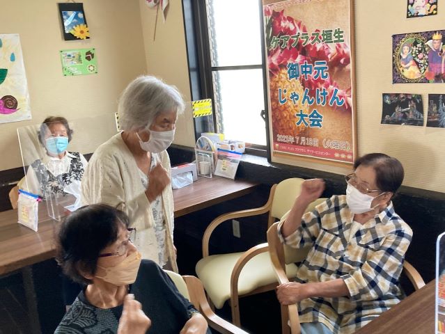 名前のくじが引かれて「ジャンケン弱いから…。」と苦笑いしていた利用者様もすぐに勝てて「こんなこともあるんやね!」と喜んでいらっしゃいました。一方で「最初はグーやけんな!」と毎度自信満々に構えていた利用者様は4回戦目の最終戦でやっと勝てました。(笑)