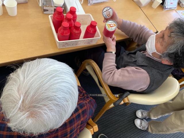 Can=缶です(笑)缶の裏面に絵を貼っており、たくさんある缶の中から同じ絵が貼ってある缶を当てるゲームです。いわゆる真剣衰弱ですね。トランプだとめくる動作が難しいですが、缶だとご利用者様もスムーズにひっくり返す動作が出来ておりました!