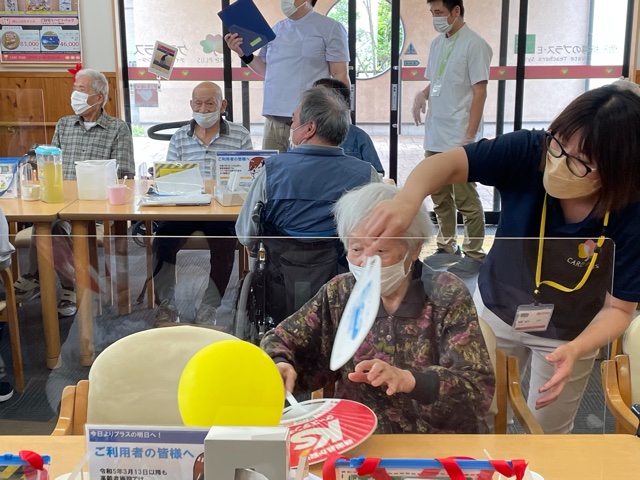風船を隣の方に順番に渡していき、早く一巡したチームが勝ちのゲームです。ケアプラス三津では団扇を用い、風船が遠くに飛んでいかないよう団扇でコントロールしていました。手が動きにくいご利用者様も団扇を用いることで参加しやすくなりました!