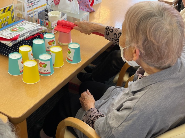 紙コップを接着した棒を用い、テーブル上に散乱している紙コップを重ねてまとめるゲームです。新しいゲームで物珍しい小道具に皆さん興味津々なご様子で、器用に棒を用いて紙コップを重ねていました♪