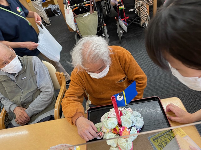 山状に重ねたお手玉を1個ずつ順番に取っていき、中央に刺した旗が倒れるまでより多くのお手玉を取ったチームが勝ちというゲームです。こちらは以前から行っていたゲームのため、皆さん要領良く行われていました。行っていた時期が5月だったので、旗の代わりに鯉のぼりが登場していますよ♪
