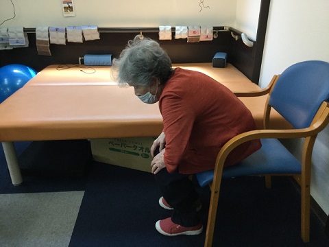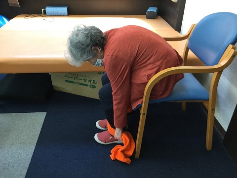 立ち上がり時に椅子に浅く腰掛けれるよう臀部を前方へ動かす訓練です。体を傾け左右のお尻を上げながら、お尻の下をくぐるようにタオルを後方から前方へ動かしています。