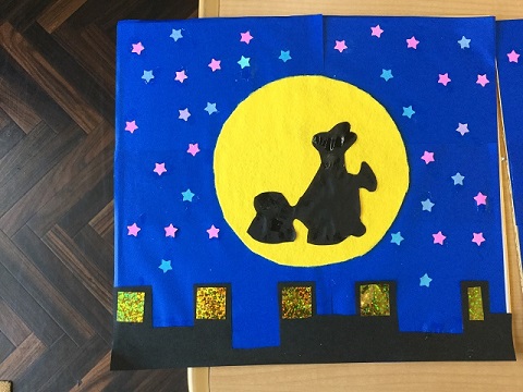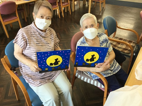 ご利用者様は「すごい可愛いね〜。黒のシルエットのうさぎさんもいいけど、周りの星もすごくいいね」と言われておりました。「うさぎさん少し切るのが難しいけど、可愛いけん頑張ろうわい」と言われ、熱心に取り組まれました。