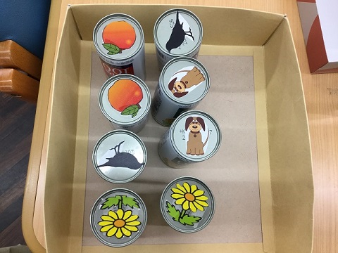 ルールは神経衰弱と一緒で、2枚組で「猿」や「犬」「たんぽぽ」など様々な絵柄が貼り付けられたカンカンを裏返し、同じ絵柄を引いていくゲームとなっております。