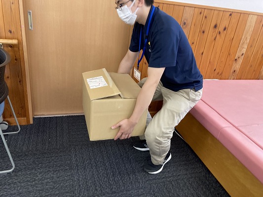 ・荷物を持ち上げる時には、下半身を使って、前かがみで荷物を持たず、膝を曲げ、腰を伸ばした姿勢で下半身の力を使って持ち上げます。