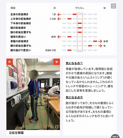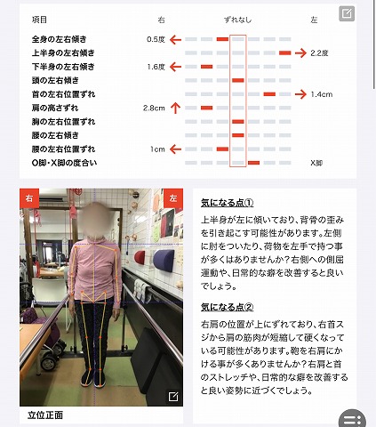 正面から見た写真では上半身、下半身ともに左右傾き、首や肩の左右の傾きなどの改善がみられます。横から見た写真では下半身や頭の位置傾きのズレがなくなり、全身や上半身の傾きは前に残っていますが傾きの角度も以前よりも改善されたのが認められます。重心の位置は前に偏っていますが正中に近い位置にあります。