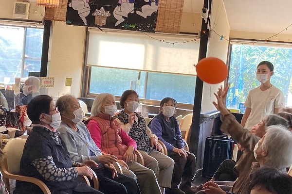 利用者様・実習生の皆様・職員が一緒になり風船送りゲームを行い各チームとも全員が協力しゴールを目指して頑張りました。開始から終了まで大盛り上がりで素晴らしいイベントの時間となりました。
