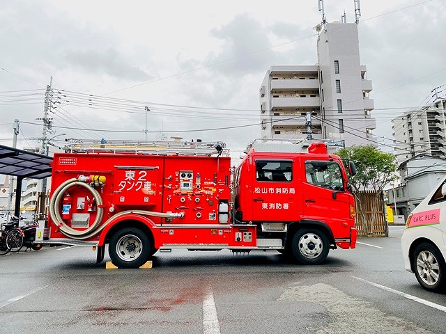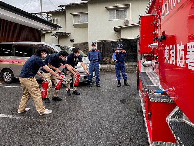 10月の末にケアプラス道後持田では実際に松山市東消防署の職員の方々に来ていただき避難訓練を実施いたしました。