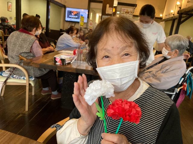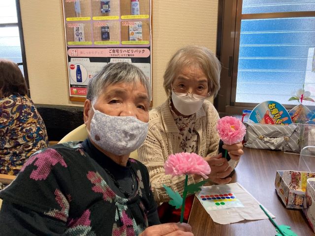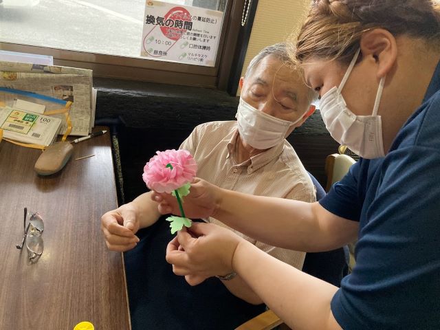 簡単そうに見えてお花紙を開くのが案外難しく、利用者の皆様は「指先が摘まみにくくて大変!」と四苦八苦されていましたが、完成したら「綺麗!」と喜ばれ、花と一緒に記念写真を撮られる方が沢山いらっしゃいました。