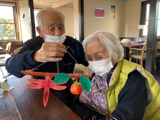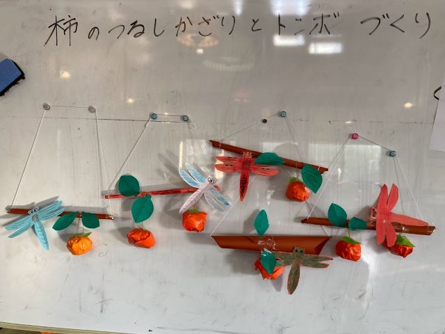 別の日曜日には秋ならではの味覚、柿をモチーフにした吊るし飾りを作成。皆様、トンボに様々な模様を描いてユニークな作品が仕上がっていました。