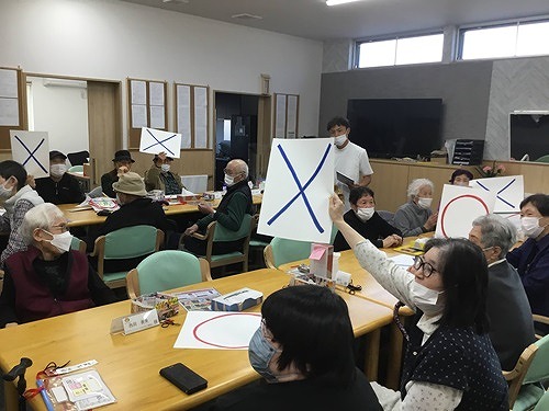 職員の特技であるけん玉を披露し、技が成功すると思う方は〇、失敗すると思う人は✕。