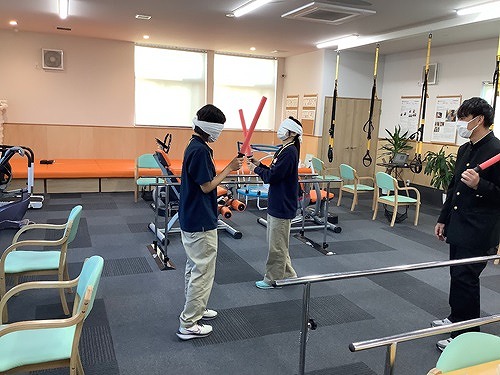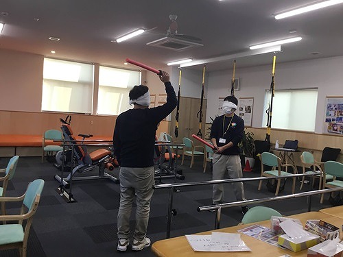 目隠しをし、竹刀を持って1対1対で剣道対決をします。竹刀を振って良いのは1人2回まで。
