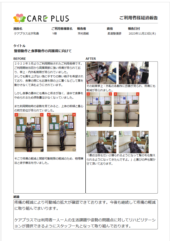 弊社で使用している姿勢測定装置は、先日TVの健康番組で有名芸能人が測定したものと同じものを使用しております。姿勢の改善は転倒予防に繋がる他に、健康な身体作りに欠かせないものです。ケアプラスのリハビリでは3か月に一度姿勢測定を行い、健康な身体作りのお手伝いをさせていただいております。