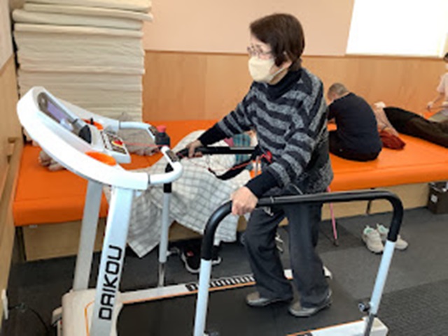 今回の症例は、特に夜間トイレに行かれる際に歩行が不安定であると話されていました。さらに本人様にお話をお聞きすると、自宅での運動習慣がないとのことで、評価より筋力やバランスの低下を認めました。そこで、エアロバイクやトレッドミルなどを用いた運動、自主トレーニングの指導を実施しました。以下が、ケアプラスで実施している機能訓練の様子(一部)です。