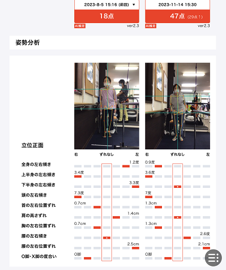 上記の訓練を行ったことで3ヶ月前の状態と比べて内転筋群、伸展筋群の筋力が向上し、O脚の改善を図ることができました。また、体幹背筋群の筋力を向上することで円背姿勢の改善を図ることができ安定した綺麗な姿勢を実現することができました。