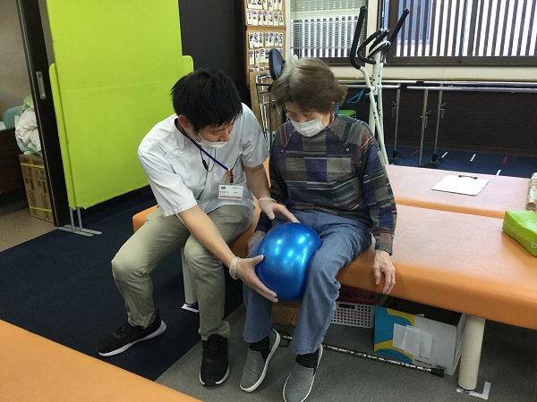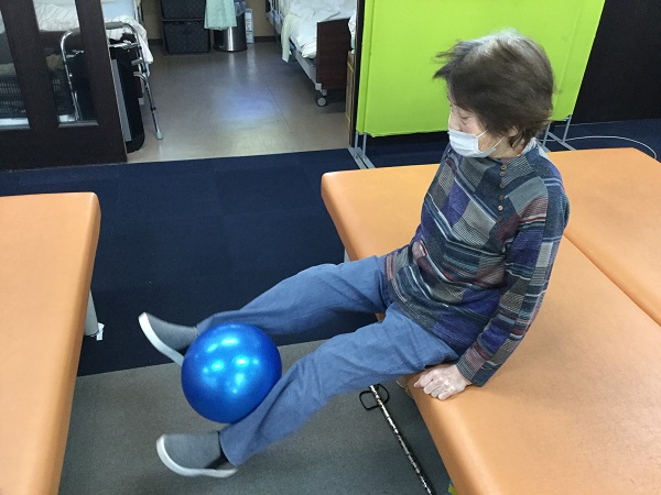 次にボールを写真1より下で挟んで頂きボールを落とさないように脚を伸ばして頂き太ももの伸筋群の筋力を向上しました。訓練時に体幹が後ろに反りすぎないように注意しながら実施して頂きました。