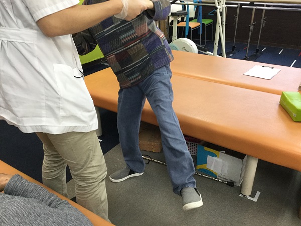 最後に安全な立位保持ができるように立位でのバランス訓練を実施しました。転倒を予防するために利用者様に両手を把持して頂き足を横に上げた状態や上に上げた状態で維持して頂きバランス能力を向上しました。
