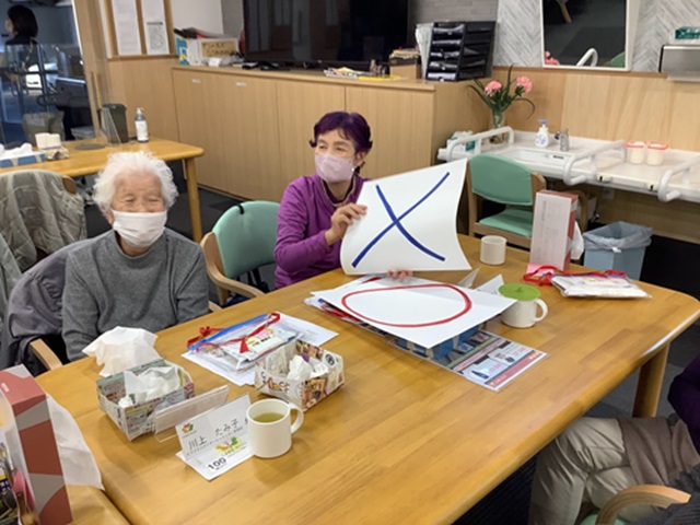 今回は〇✕クイズと目隠し剣道を行いました。〇✕クイズは職員が考えた自分についての〇✕クイズを出して利用者様に答えていただくというゲームです。4人1組のチームで行ったので利用者様の間でもコミュニケーションを取られておりとても盛り上がっておりました。